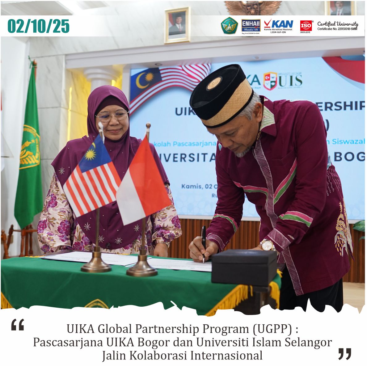 Bogor, 2 Oktober 2025 – Sekolah Pascasarjana Universitas Ibn Khaldun (UIKA) Bogor meluncurkan agenda UIKA Global Partnership Program (UGPP) dengan menerima kunjungan delegasi Universiti Islam Selangor (UIS) Malaysia di Ruang Conference, Kamis (2/10). Kegiatan ini mencakup benchmarking, pemaparan program unggulan, serta penandatanganan Letter of Intent (LoI) sebagai simbol komitmen kolaborasi internasional.