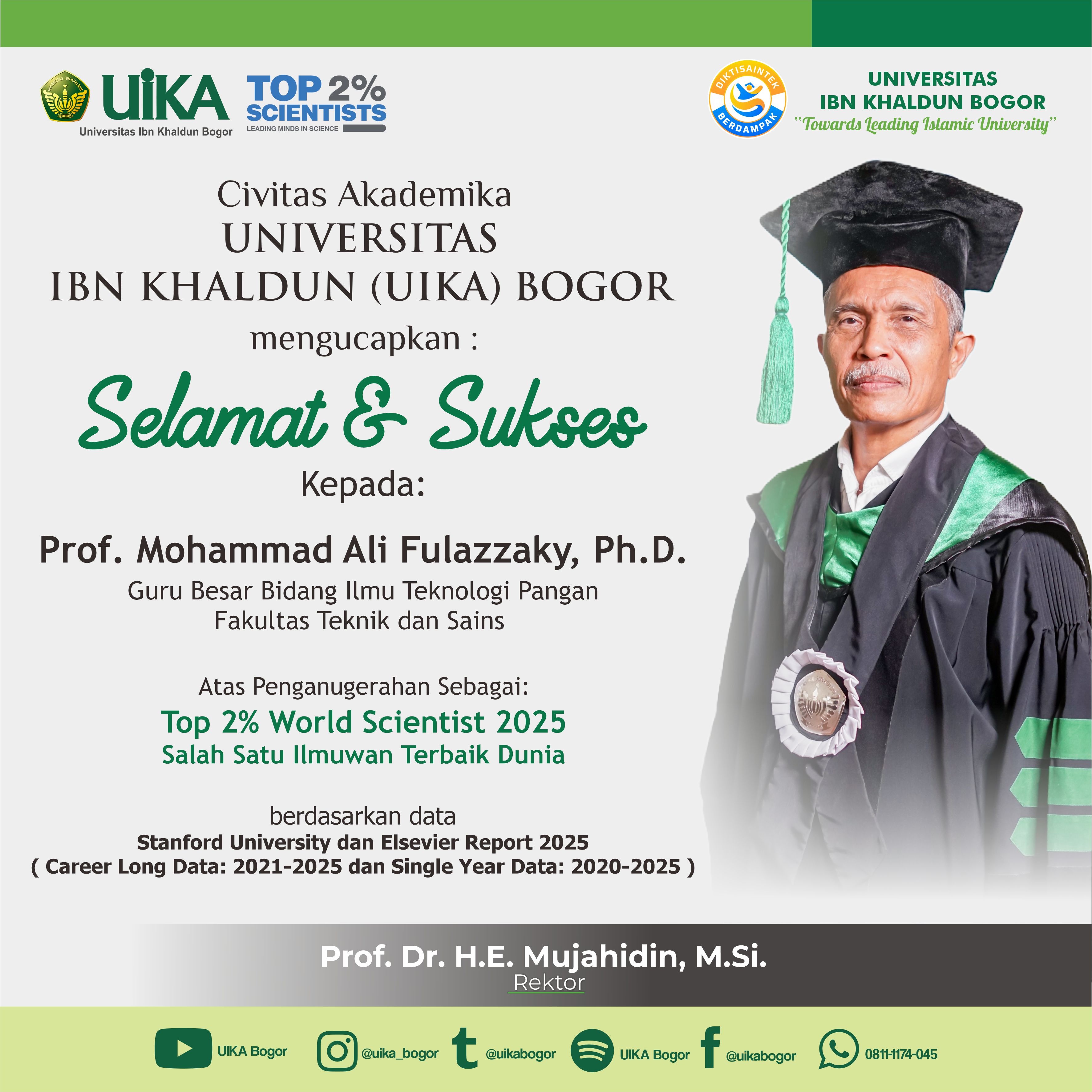 Bogor — Kabar membanggakan kembali datang dari Universitas Ibn Khaldun (UIKA) Bogor. Dosen Program Studi Ilmu Lingkungan, Fakultas Teknik dan Sains, Prof. Mohamad Ali Fulazzaky, dinobatkan sebagai salah satu ilmuwan paling berpengaruh di dunia tahun 2025 oleh Stanford University bekerja sama dengan penerbit ilmiah terkemuka Elsevier.
