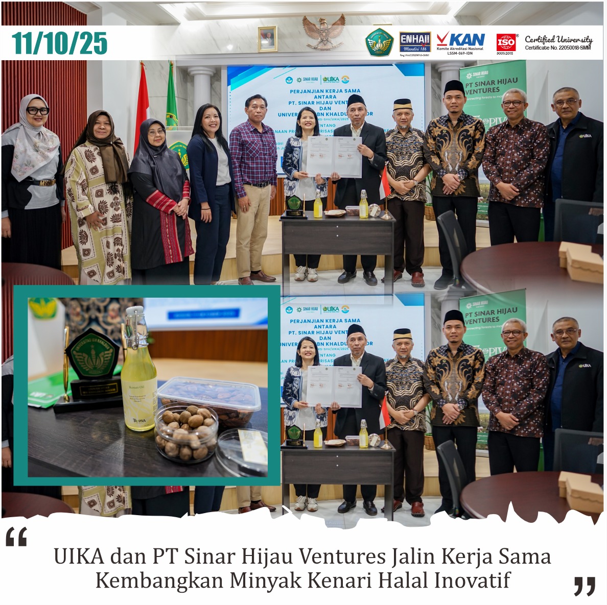 Kolaborasi ini berfokus pada penelitian berjudul “Optimalisasi Teknologi Pengolahan Minyak Kenari Berbasis Ekstraksi Modern dan Jaminan Halal untuk Peningkatan Rendemen dan Kualitas Produk.” Melalui program ini, UIKA dan SHV berupaya menghadirkan inovasi pengolahan minyak kenari (Canarium indicum) yang bernilai tambah tinggi dan memperkuat posisi kenari sebagai komoditas unggulan halal Indonesia di sektor pangan dan kosmetik.