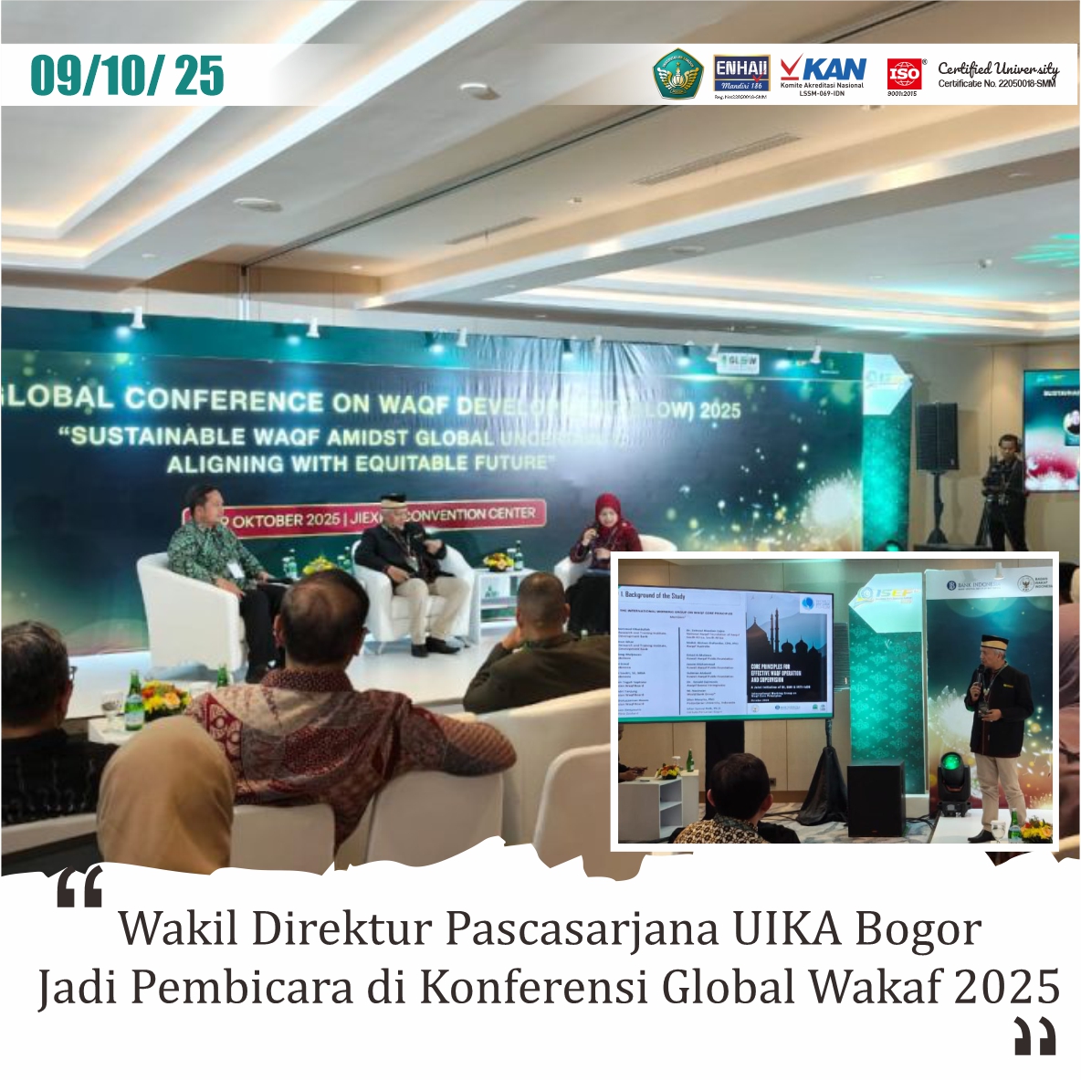 Jakarta – Wakil Direktur I Sekolah Pascasarjana Universitas Ibn Khaldun (UIKA) Bogor, H. Hendri Tanjung, Ph.D, tampil sebagai salah satu pembicara pada The First Global Conference on Waqf Development 2025. Acara internasional ini digelar oleh Badan Wakaf Indonesia (BWI) bekerja sama dengan Bank Indonesia dalam rangkaian Indonesia Sharia Economic Festival (ISEF) di JI Expo Kemayoran, Jakarta, Rabu (8/10/2025).